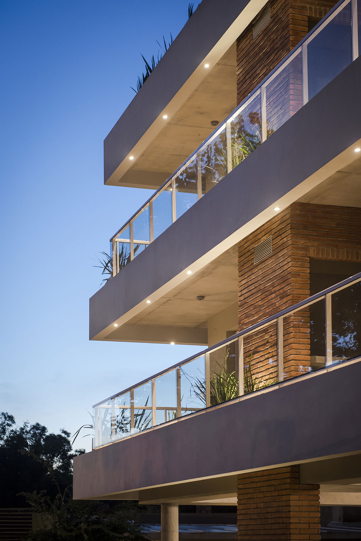 Edificio con tres niveles habitables más planta baja libre con parque central y parking perimetral. Bandejas horizontales de color blanco que dialogan con fachadas en ladrillo visto y cristal. La morfología de la planta del conjunto en forma de «V» libera un parque de acceso de ancho variable donde se ubica el acceso principal. El conjunto cuenta con 26 unidades organizadas en dos núcleos de circulación vertical. Cada unidad cuenta con dos plazas de parking con bauleras, además de piscina y barbacoa de uso colectivo.